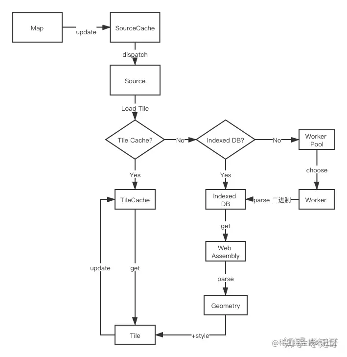 在解析过程中,利用 LRU (最近最少使用)缓存机制,对 Tile 做了第一层缓存。在 Source 算出 Tile ID 后,会首先从 TileCache 中寻找 Tile,Tile 计算完成后,也会更新 TileCache。