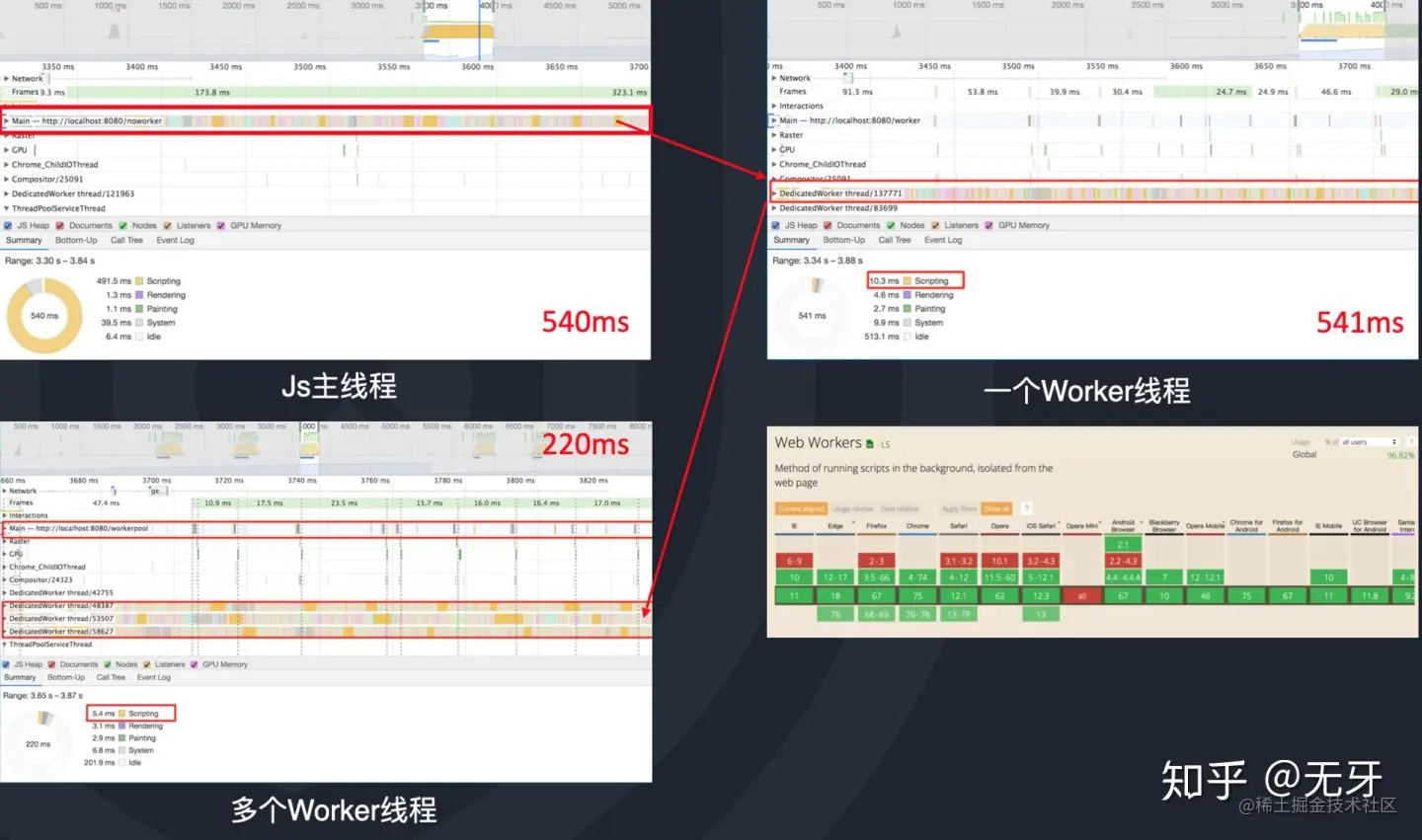 下图为一个测试对比,同屏加载256张瓦片图,使用单个进程需要542ms,使用3个Worker的总计算时间为220ms,且主进程没有被影响。