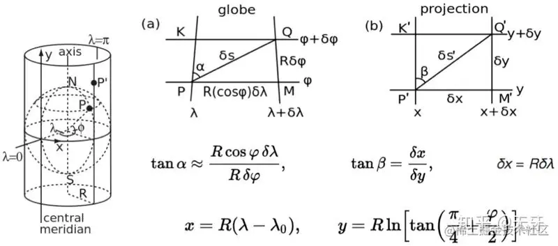 墨卡托投影是由荷兰地图学家墨卡托(Mercator)在 1569 年创拟,设想地球被围在一个中空的圆柱里,赤道与圆柱相切,再假想地球中心有一盏灯,把球面上的图形投影到圆柱体上,再把圆柱体展开,这就是一幅标准纬线为零度(即赤道)的“墨卡托投影”绘制出的世界地图。(以上来自百科)