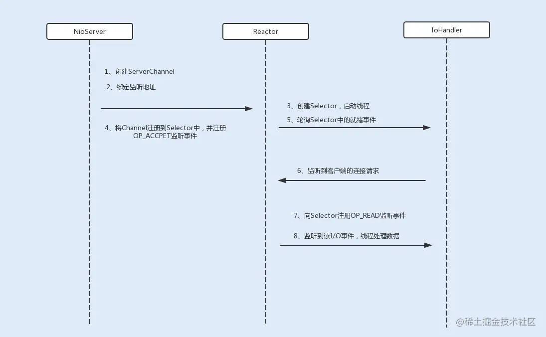 - 事件分离器 Reactor:接收请求后,会将建立的连接注册到分离器中,依赖于循环监听多路复用器 Selector,一旦监听到事件,就会将事件 dispatch 到事件处理器;