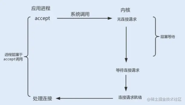 - 最后,应用服务会通过系统调用 accept 来监听客户端的连接请求。