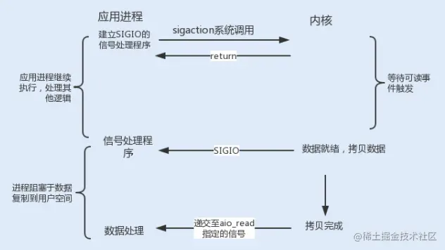 信号驱动式 I/O 类似观察者模式,内核就是一个观察者,信号回调则是通知。用户进程发起一个 I/O 请求操作,会通过系统调用 sigaction 函数,给对应的套接字注册一个信号回调,此时不阻塞用户进程,进程会继续工作。当内核数据就绪时,内核就为该进程生成一个 SIGIO 信号,通过信号回调通知进程进行相关 I/O 操作。