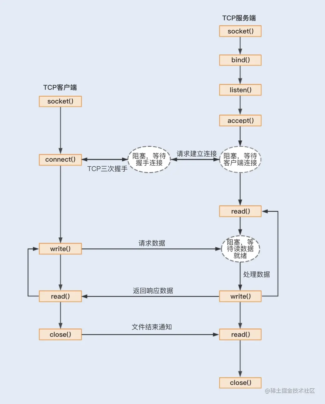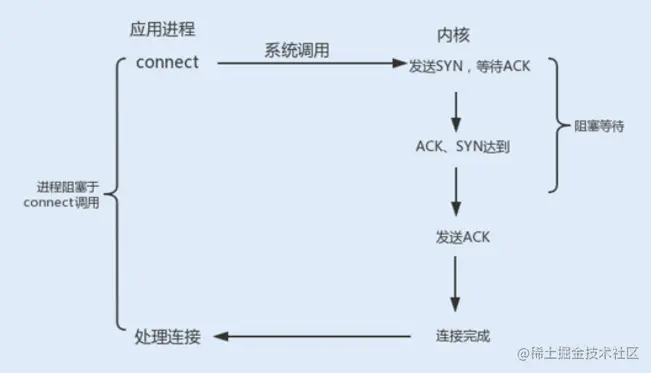 connect 阻塞:当客户端发起 TCP 连接请求,通过系统调用 connect 函数,TCP 连接的建立需要完成三次握手过程,客户端需要等待服务端发送回来的 ACK 以及 SYN 信号,同样服务端也需要阻塞等待客户端确认连接的 ACK 信号,这就意味着 TCP 的每个 connect 都会阻塞等待,直到确认连接。