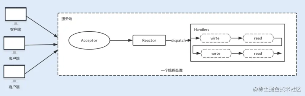 最开始 NIO 是基于单线程实现的,所有的 I/O 操作都是在一个 NIO 线程上完成。由于 NIO 是非阻塞 I/O,理论上一个线程可以完成所有的 I/O 操作。