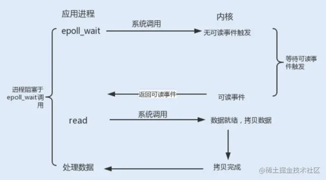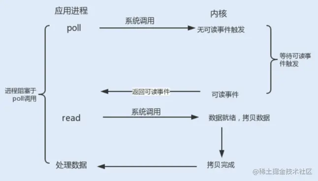 Linux 提供了 I/O 复用函数 select/poll/epoll,进程将一个或多个读操作通过系统调用函数,阻塞在函数操作上。这样,系统内核就可以帮我们侦测多个读操作是否处于就绪状态。