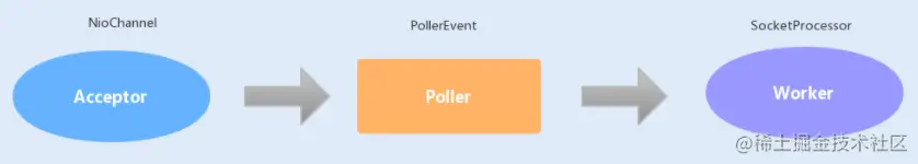 在 NIO 中,Tomcat 新增了一个 Poller 线程池,Acceptor 监听到连接后,不是直接使用 Worker 中的线程处理请求,而是先将请求发送给了 Poller 缓冲队列。在 Poller 中,维护了一个 Selector 对象,当 Poller 从队列中取出连接后,注册到该 Selector 中;然后通过遍历 Selector,找出其中就绪的 I/O 操作,并使用 Worker 中的线程处理相应的请求。