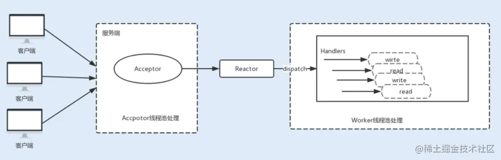 现在主流通信框架中的 NIO 通信框架都是基于主从 Reactor 线程模型来实现的。在这个模型中,Acceptor 不再是一个单独的 NIO 线程,而是一个线程池。Acceptor 接收到客户端的 TCP 连接请求,建立连接之后,后续的 I/O 操作将交给 Worker I/O 线程。