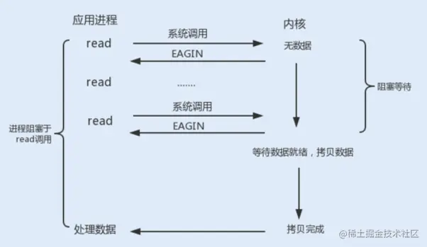 使用 fcntl 可以把以上三种操作都设置为非阻塞操作。如果没有数据返回,就会直接返回一个 EWOULDBLOCK 或 EAGAIN 错误,此时进程就不会一直被阻塞。