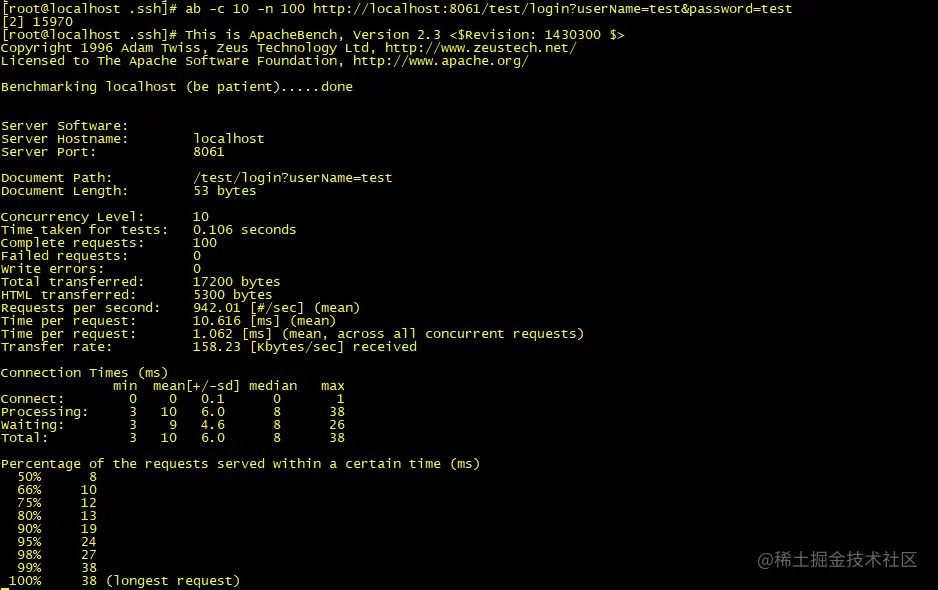 ab 工具用来测试 post get 接口请求非常便捷,可以通过参数指定请求数、并发数、请求参数等。例如,一个测试并发用户数为 10、请求数量为 100 的的 post 请求输入如下: