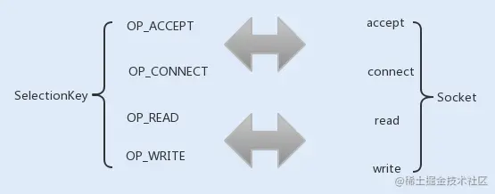 我们在上面的 TCP 通信流程中讲到,Socket 通信中的 conect、accept、read 以及 write 为阻塞操作,在 Selector 中分别对应 SelectionKey 的四个监听事件 OP_ACCEPT、OP_CONNECT、OP_READ 以及 OP_WRITE。