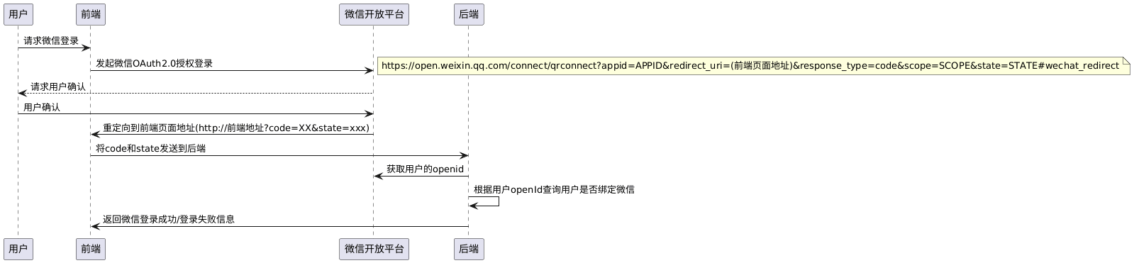 实现方式:前端实现与微信交互的部分逻辑。然后将微信回调之后的code和state传给后端,由后端去微信获取个人用户信息并返回给前端。 业务需求: 微信登录,需要校验用户是否绑定微信,未绑定提示用户去app绑定微信。