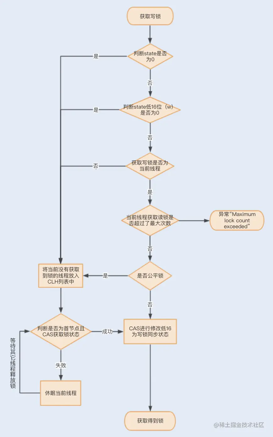 此时再判断同步状态 state 的低 16 位(w)是否为 0,如果 w 为 0,则说明其它线程获取了读锁,此时进入 CLH 队列进行阻塞等待;如果 w 不为 0,则说明其它线程获取了写锁,此时要判断获取了写锁的是不是当前线程,若不是就进入 CLH 队列进行阻塞等待;若是,就应该判断当前线程获取写锁是否超过了最大次数,若超过,抛异常,反之更新同步状态。