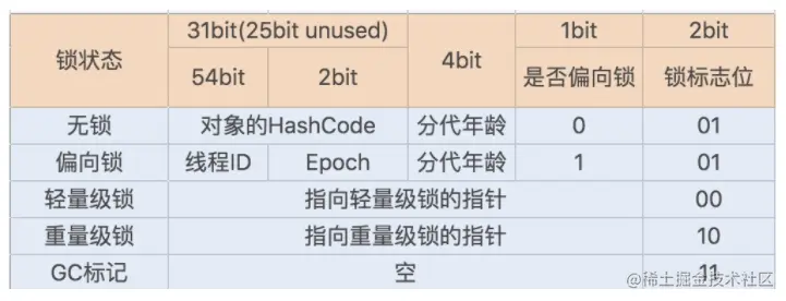 Mark Word 记录了对象和锁有关的信息。Mark Word 在 64 位 JVM 中的长度是 64bit,我们可以一起看下 64 位 JVM 的存储结构是怎么样的。如下图所示: