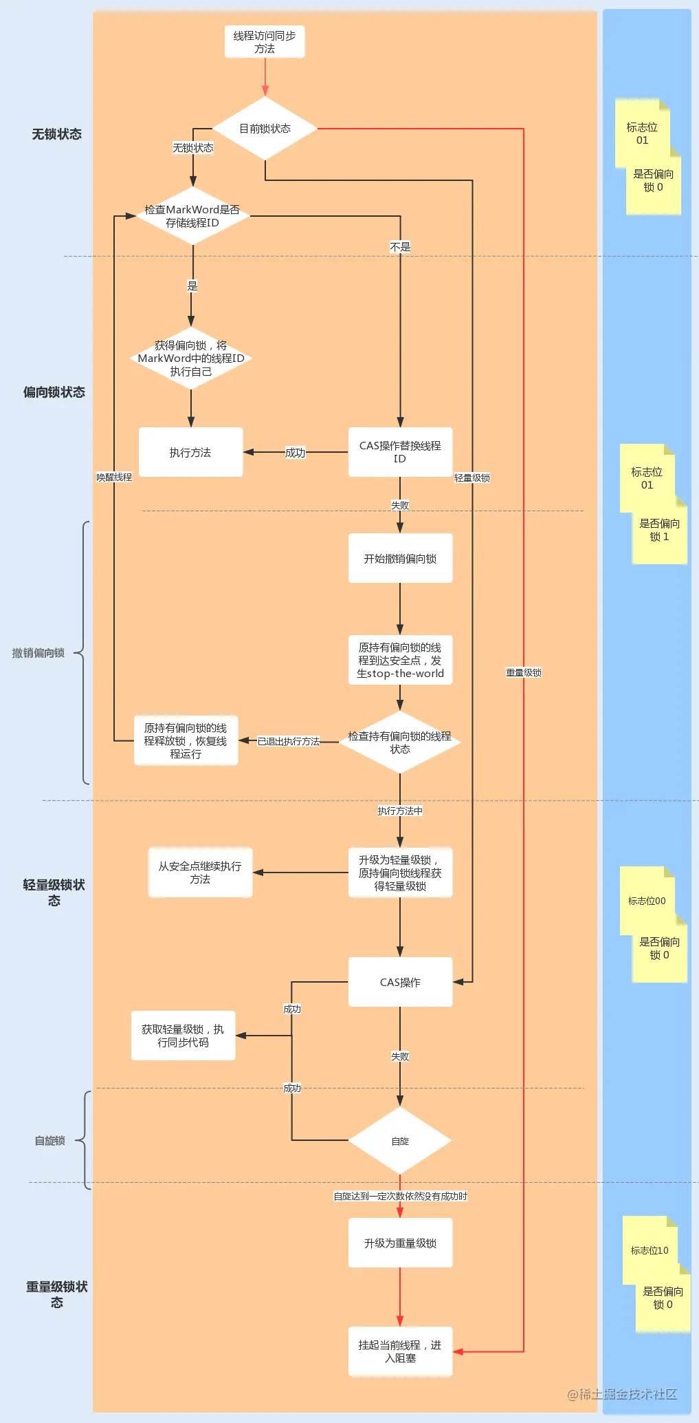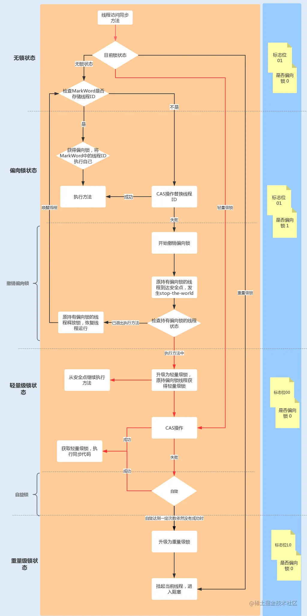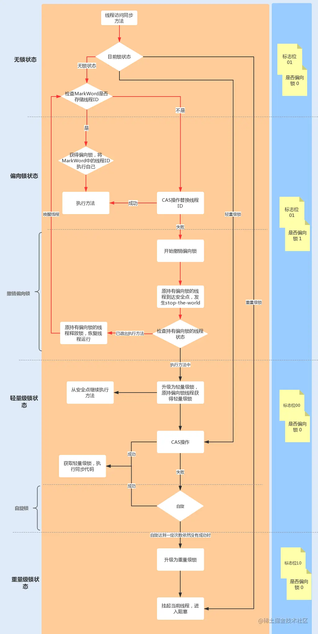 下图中红线流程部分为偏向锁获取和撤销流程: