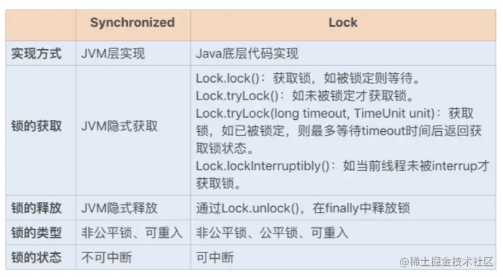 Lock 同步锁是基于 Java 实现的,而 Synchronized 是基于底层操作系统的 Mutex Lock 实现的,每次获取和释放锁操作都会带来用户态和内核态的切换,从而增加系统性能开销。