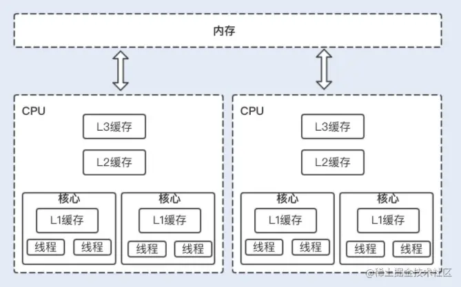 处理器和物理内存之间的通信速度要远慢于处理器间的处理速度,所以处理器有自己的内部缓存。如下图所示,在执行操作时,频繁使用的内存数据会缓存在处理器的 L1、L2 和 L3 高速缓存中,以加快频繁读取的速度。