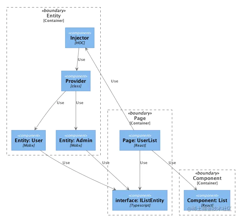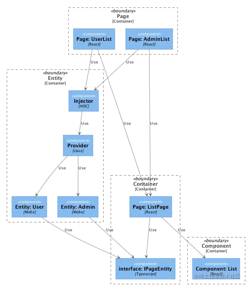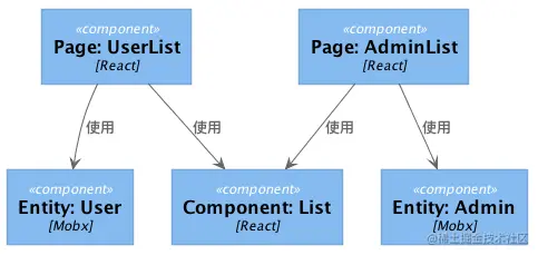 「Entity 属于底层模块,Page 属于上层模块,这种依赖关系导致 Page 无法获得有效的复用。React 的 props 天然可以作为这个场景下的一个抽象,让 Entity 这个底层模块通过属性的方式传递过来,而作为上层模块的 Page 只需要依据 interface 的定义来使用它实现自己的业务逻辑,我给你画个图感受一下」