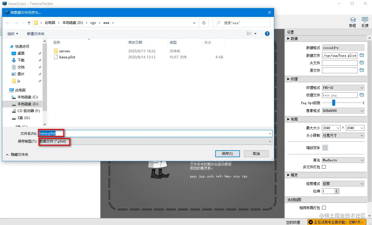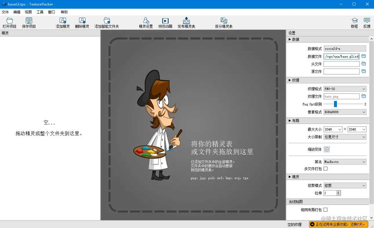 cocos制作图集的步骤 cgctm6 2020-08-14 522 阅读1分钟 1.将要制作图集的图片拖拽放置到TexturePackerGUI中 2.选择数据格式为: cocos2d-x 3.数据文件保存的格式为.plist文件 4.点击发布精灵表 5.之后会生成.png格式的图片和.plist(记录单张图片旋转等信息)的文件,把这两个文件放置到cocos中