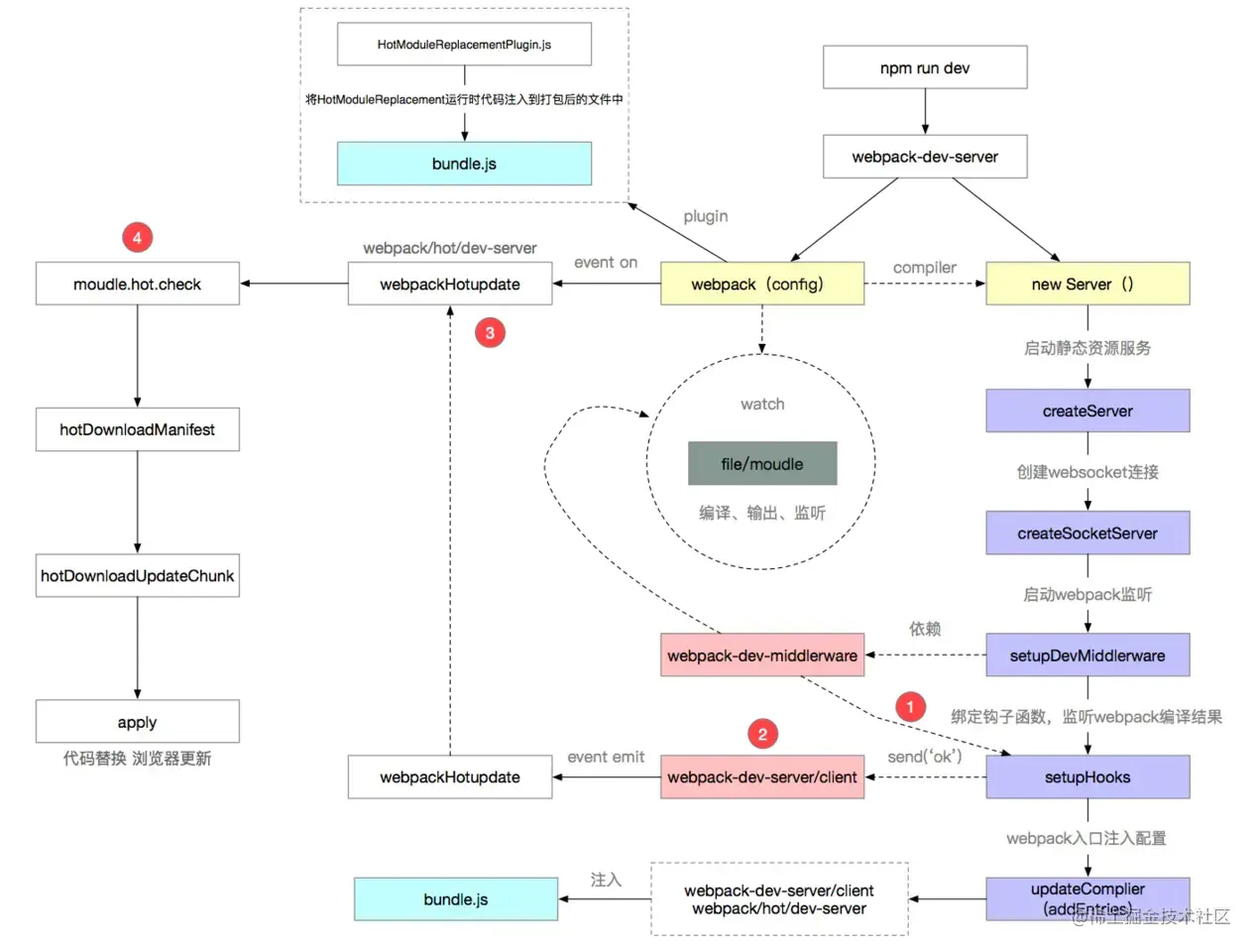 - 本地server启动之后,再去启动websocket服务。通过websocket,可以建立本地服务和浏览器的双向通信。这样就可以实现当本地文件发生变化,立马告知浏览器可以热更新代码啦!