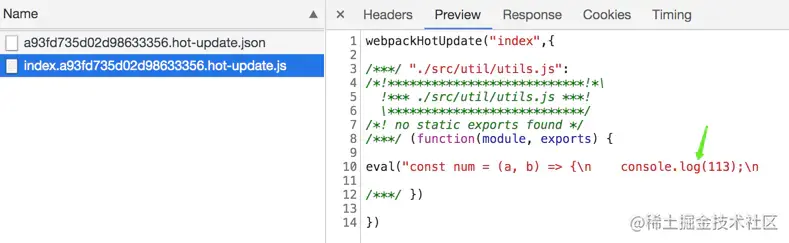 然后看一下,新生成的文件是什么?每次修改代码,紧接着触发重新编译,然后浏览器就会发出 2 次请求。请求的便是本次新生成的 2 个文件。如下: