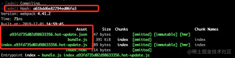 首先,我们知道Hash值代表每一次编译的标识。其次,根据新生成文件名可以发现,上次输出的Hash值会作为本次编译新生成的文件标识。依次类推,本次输出的Hash值会被作为下次热更新的标识。