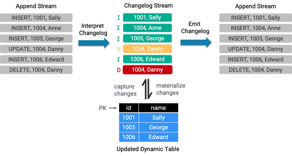 如上图所示,理论上,CDC 同步到 Kafka 的数据就是 Append 的一个流,只是在格式中含有 Changelog 的标识: