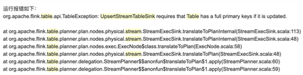 UpsertStreamTableSink 需要上游的 Query 有完整的 Primary Key 信息,不然就直接抛异常。这个现象涉及到 Flink 的 UpsertStreamTableSink 机制。顾名思义,它是一个更新的 Sink,需要按 Key 来更新,所以必须要有 Key 信息。 如何发现 Primary Key?一个方法是让优化器从 Query 中推断,如下图发现 Primary Key 的例子。 这种情况下在简单 Query 当中很好,也满足语义,也非常自然。但是如果是一个复杂的 Query,比如聚合又 Join 再聚合,那就只有报错了。不能期待优化器有多智能,很多情况它都不能推断出 PK,而且,可能业务的 SQL 本身就不能推断出 PK,所以导致了这样的异常。