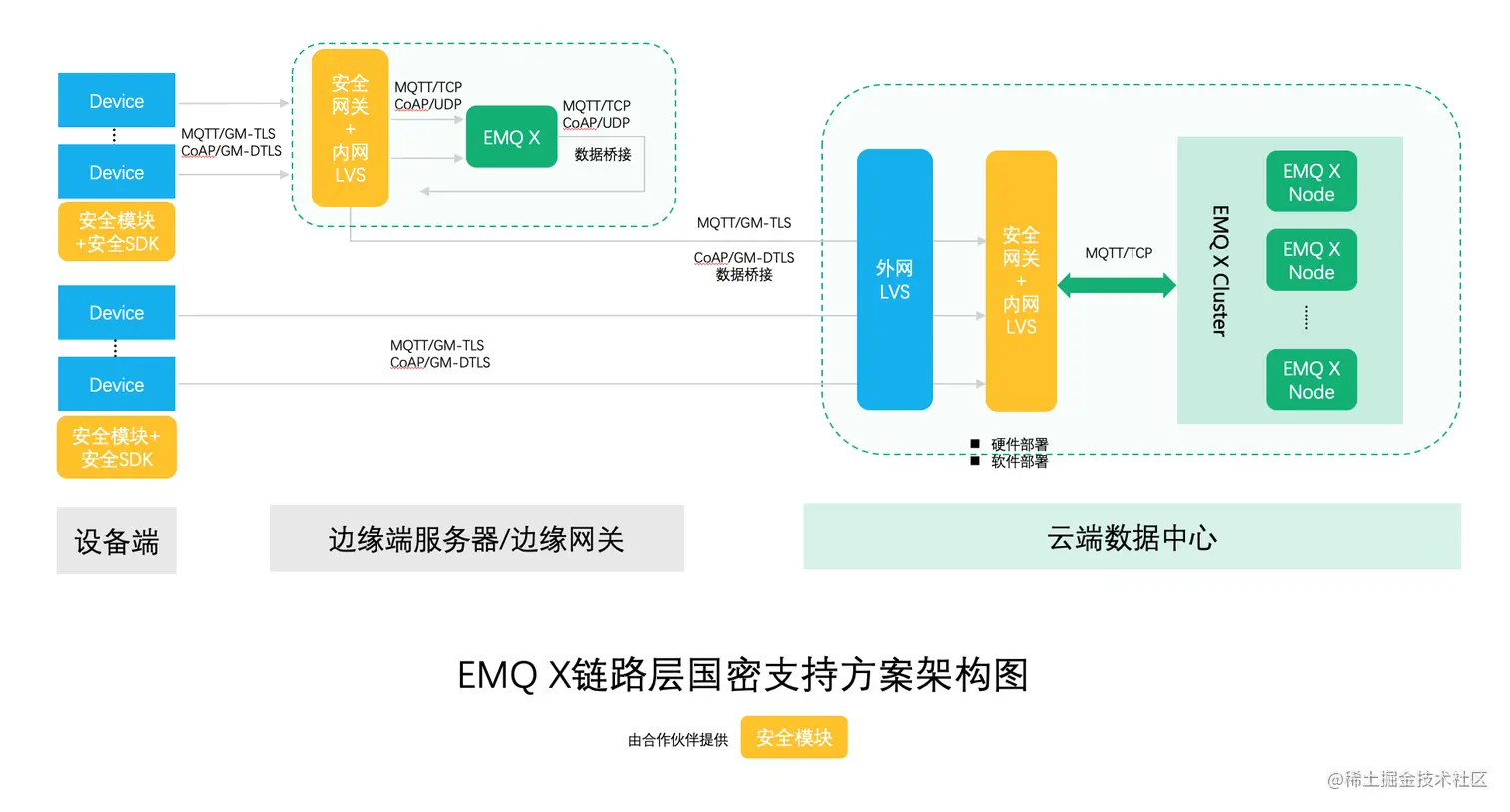 - 云端 EMQ X 集群和边缘端 EMQ 节点通过内网LVS对接安全接入网关,实现国密安全服务能力调用;安全接入网关对接后端安全认证区,与证书/密钥管理系统、服务器密码机等安全设备连接,对设备接入安全提供保障