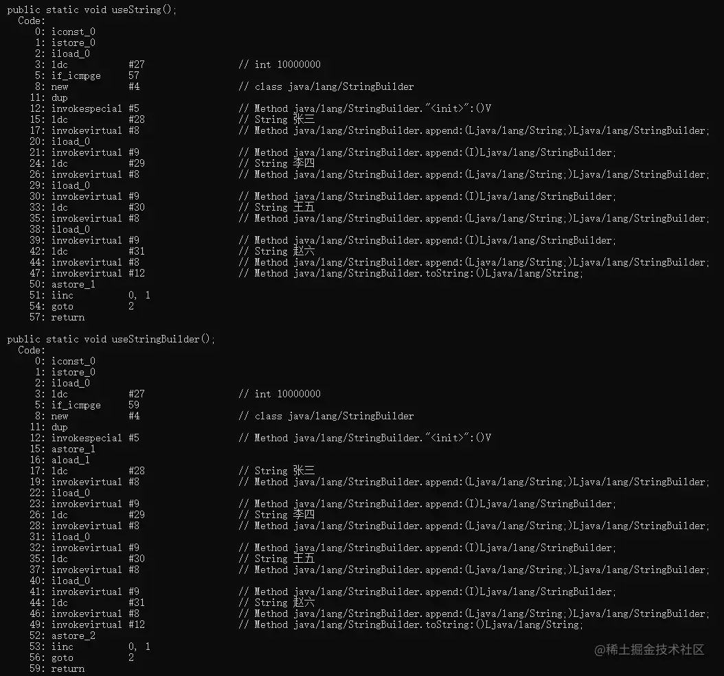 使用 javap -c StringTest.class 反编译查看两个方法编译后的文件: