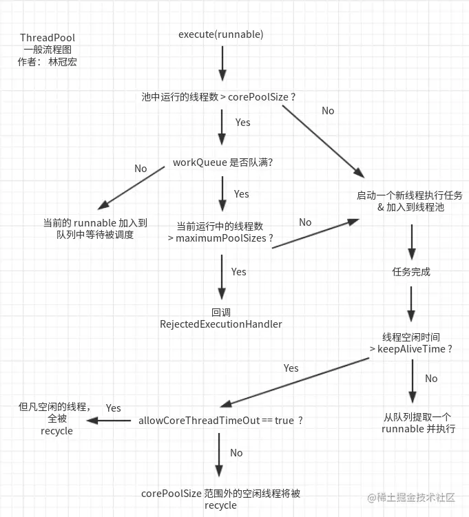 - 如果当前线程处于运行状态,并且写入阻塞队列成功。双重检查,再次获取线程状态;如果线程状态变了(非运行状态)就需要从阻塞队列移除任务,并尝试判断线程是否全部执行完毕,同时执行拒绝策略。