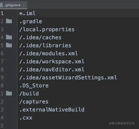 然后忽略文件的设置,主要是我的as经常找到那个设置忽略文件的界面,所以我一般情况下都是在项目的根目录下面找下面这个文件**.gitignore **