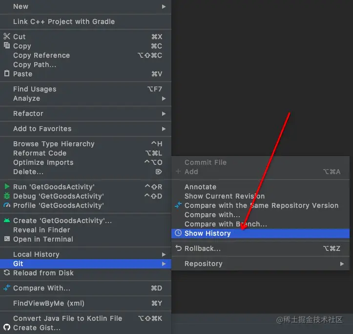 这个就比较简单了,选中这个文件,然后右键菜单中有一个git,有一个show history