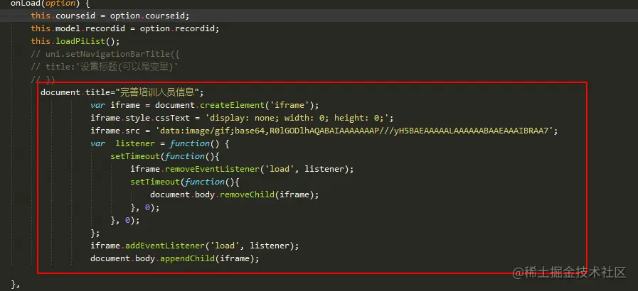 下面的红色框框的就是关键的代码 直接把他放到onLoad的周期函数里面 修改doucument.title 就会修改 微信浏览器的标题