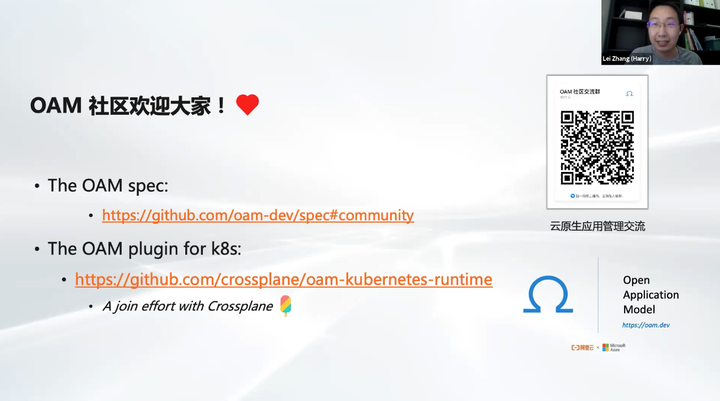 上面最后希望大家踊跃加入 OAM 社区,参与讨论。上图中有钉钉群二维码,目前人数有几千人,讨论非常激烈,我们会在里面讨论 GitOps,CI/CD,构建 OAM 平台等等。OAM 也有亚太地区的周会,大家可以去参加。上面的链接是开源项目地址,将这个安装到 Kubernetes 中就可以使用上面我们说的这些能力了。