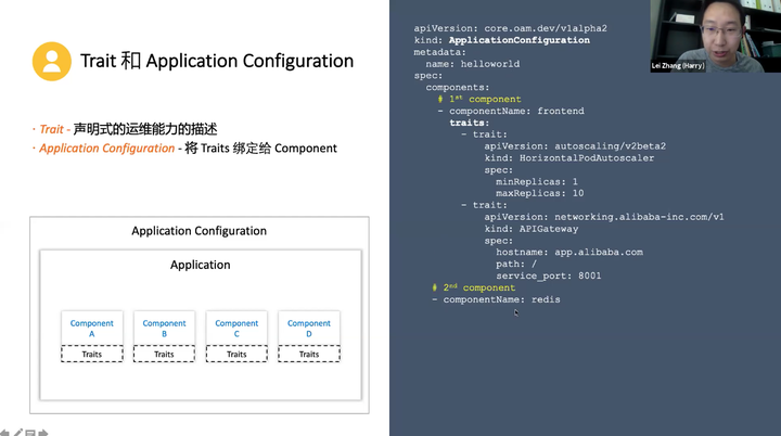 第二个叫做应用特征,叫做 Traits。运维侧的概念,比如扩容策略,发布策略,这些策略通过一个叫做 Traits 的 API 暴露给用户。首先 OAM 给你做了一个应用层定义抽象的方式,分别叫做 Components 和 Traits。由于你需要将 Traits 应用特征关联给应用组件 Components,例如 Deployment 需要某种扩容策略或者是发布策略,怎么把他们关联在一起呢?