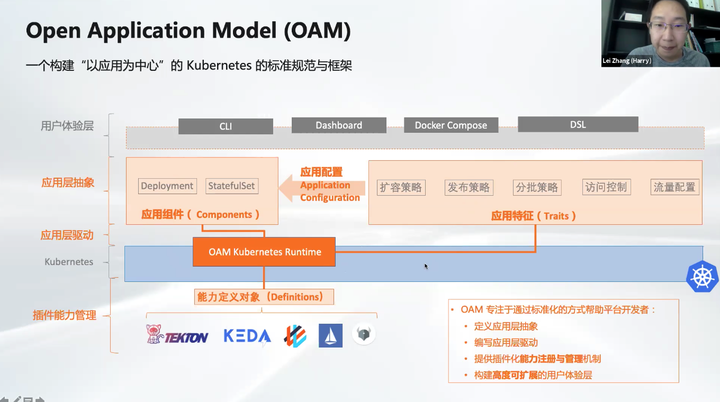 所以今天所介绍的 OAM 是一个统一、标准、高可扩展的应用管理平台,能够以应用为中心的全新的 Kubernetes,这是今天讨论的一个重点。OAM 这个项目就是支撑这种理念的核心依赖和机制。简单地来说 OAM 能够让你以统一的,标准化的方式去做这件事情。比如标准化定义应用层抽象,标准化编写底层应用驱动,标准化管理 K8s 插件能力。