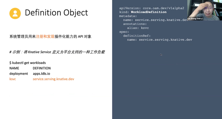 比如我想讲 Knative Service 定义为平台支持的一种工作负载,如上图只需要简单的写一个文件即可。其中在 definitionRef 中引用 service.serving.knative.dev 即可。这样的好处就是可以直接用 kubectl get Workload 查看 Knative Service 的 Workload。所以这是一个用来注册和发现插件化能力的机制,使得用户非常简单的看到系统中当前有没有一个工作负载叫做 Knative Service。而不是让用户去看 CRD,看插件是否安装,看 Controller 是否 running,这是非常麻烦的一件事情。所以必须有这么一个插件注册和发现机制。