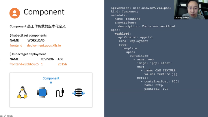 今天可以定义为 Deployment,明天可以定义为一个非常简单的版本。也就是说我 Components 的抽象程度完全取决于用户自己决定的。后期也可以改成 Knative Service,甚至改成一个 Open PaaS。所以说在 Components 的 Workload 部分你可以自由的去定义自己的抽象。只要你提前安装了对应 CRD 即可,这是一个非常高级的玩法。