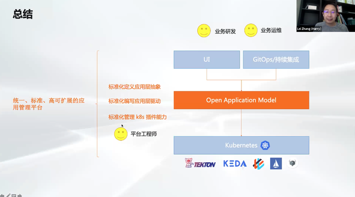 以上就是 OAM 给平台工程师带来的一些特有的价值。简单来说是统一、标准的 API,区分研发和运维策略,让你的 UI 和 GitOps 特别容易去构建。另一点是向下提供了高可扩展的管理 K8s 插件能力。这样的系统真正做到了标准,自运维,一个以应用为中心和用户为中心的 Kubernetes 平台。