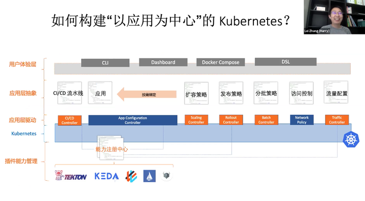 用户体验层怎么做,完全取决于用户接受什么样的方式。关键点在于以应用为中心的 Kubernetes,UI 层就可以非常方便的基于应用层抽象去做。比如 CLI 就可以直接创建一个流水线和应用,而不是兜兜转转去创建 Deployment 和 Pod,这两个的衔接方式是完全不一样的。pipeline 只需要生成一下就结束了。然后去把 Pod 和 Deployment 组成一个 Pipeline,那这个工作就非常繁琐了。这是非常重要的一点,当你有了应用层驱动,应用层抽象,插件能力管理,再去构建用户体验层就会非常非常简单。
