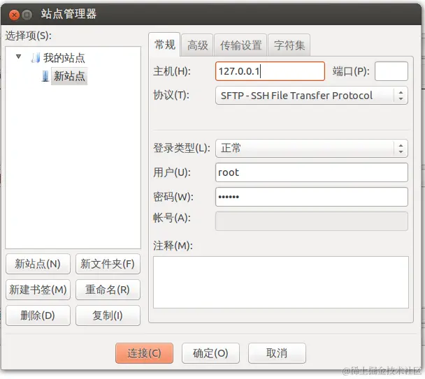 打开[文件] -> [站点管理器],出现一下界面,并按照要求填写。