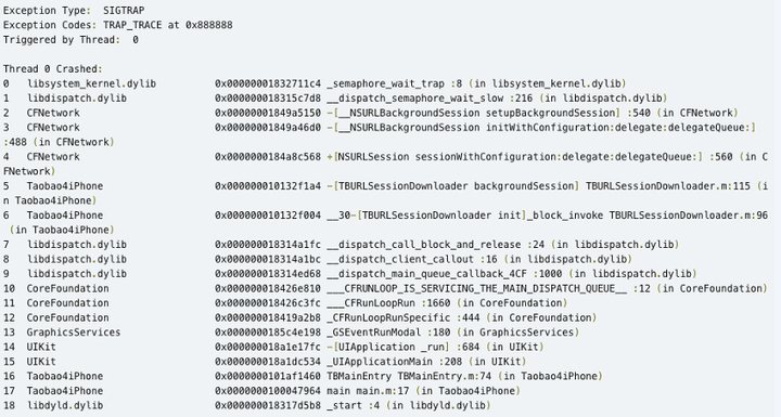 Facebook的工程师将App退出分为以下6个类别: 1.App内部主动调用exit()或abort()退出; 2.App升级过程中,用户进程被杀死; 3.系统升级过程中,用户进程被杀死; 4.App在后台被杀死; 5.App在前台被杀死,且可获取堆栈; 6.App在前台被杀死,且无法获取堆栈。 对于第1~4类退出,属于App的正常退出,对用户体验没有太大影响,无需进行相应处理;对于第5类退出,可通过堆栈代码级定位崩溃原因,对此业界已形成比较成熟的解决方案,推荐免费试用[阿里云的崩溃分析服务](https://www.aliyun.com/product/emascrash/crash),即可快速定位、解决此类崩溃问题;对于第6类退出,可能的原因很多,包括但不限于:系统内存不足时继续申请内存、主线程卡死20s以上、CPU使用率过高Stack Overflow等,在此我们统一称之为iOS客户端的“Abort问题”。 Abort问题无法被堆栈捕获,且发生频次远高于可被捕获的崩溃(下称“堆栈崩溃”)。从历史数据来看,手淘(电商类超级App代表)的Abort问题数量一般是堆栈崩溃数量的3倍左右;优酷Pad(视频类超级App代表)的Abort问题数量一般是堆栈崩溃数量的5倍左右。可见,Abort问题对用户的使用体验造成巨大影响。 本文将针对iOS客户端的Abort问题,进行根因定位分析,并提出系统性解决方案。 二、Abort问题的原因分类 形成Abort问题的原因主要包括以下4个。 2.1 内存Jetsam 移动端设备的物理内存资源紧张,但App仍不断申请内存。因此系统signal 9杀死进程,造成异常退出。