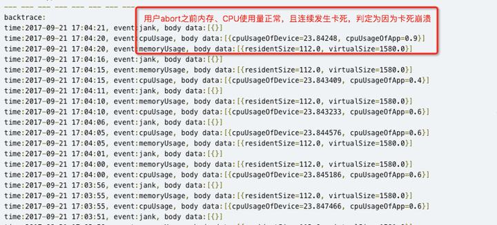 由于Abort问题出现之前,内存、CPU使用量正常,因此初步判断造成异常退出的原因为主线程死锁。