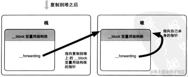 - 当block被复制到堆上之后,block所引用的__block变量也会被复制到堆上,这样在栈上和堆上各存在一份__block变量,此时将栈上__block变量中的__forwarding指针指向堆上__block变量的地址,同时,堆上的__block变量中的__forwarding指针指向它本身,那么此时,不管我们是访问栈上__block变量中的属性值还是堆上__block变量中的属性值,都是通过__forwarding指针访问到堆上的__block变量。