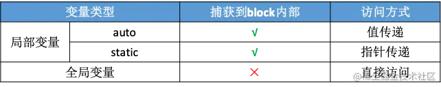 - 当block访问的是auto类型的局部变量时,会将局部变量捕获到block内部的结构体中,并且是直接捕获变量的值。