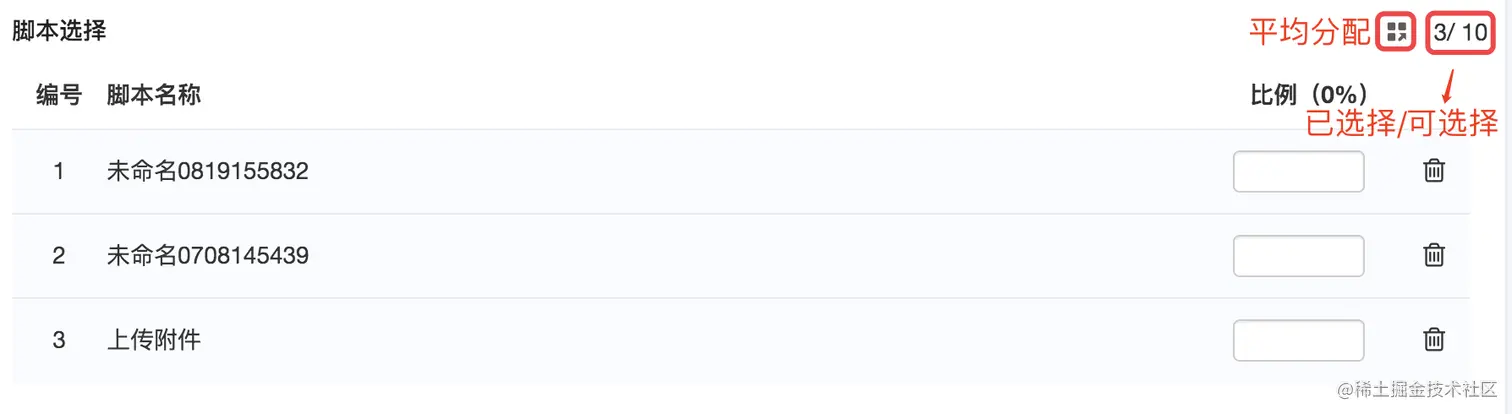 · 选择脚本后,可以点击 平均分配 按钮,平均分配脚本比例,也可以手动输入脚本比例;