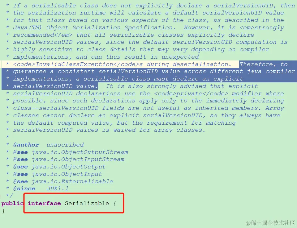 可以看到,序列化接口只是一个接口,一个标识符,继承了标识符,我们才能正确的序列化。同时,源码中也强烈建议为了确保不同的编译器的UID一致,UID必须显示声明。