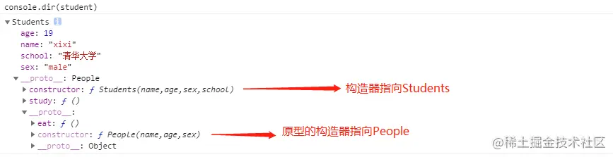 如果打印出student对象,可以看到如下结果,即student的原型的constructor指向Students构造函数,原型的原型的constructor指向People构造函数,JavaScript通过这样的原型链实现了继承。