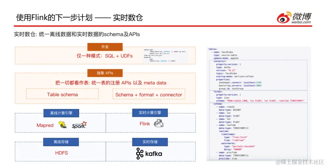 目前已经通过 Flink SQL 的方式实现了开发,但是实时和离线表的注册还有元数据存储是有一定差异的,希望可以抽象出一层 API 用统一的方式来进行实时和离线表的注册以及元数据的存储。