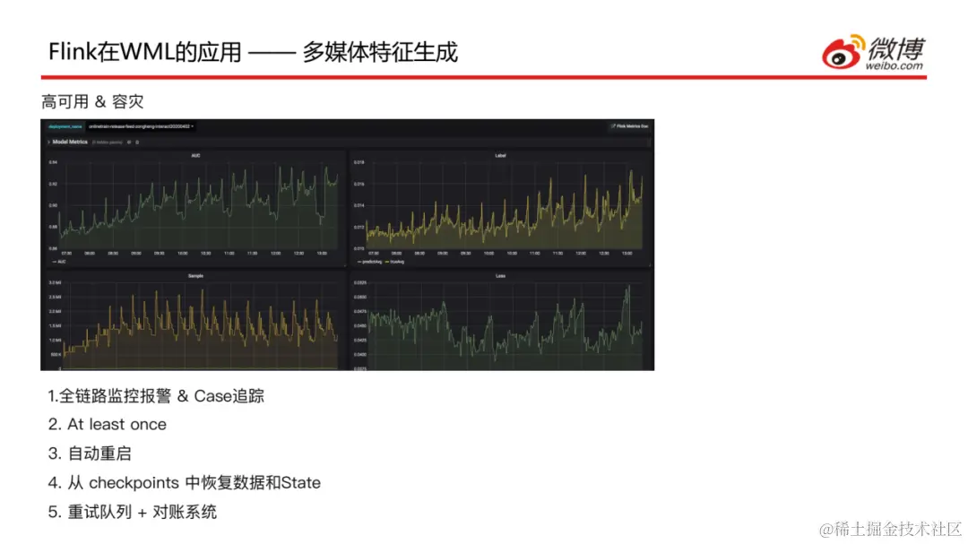 这个是样本服务任务提交的方式,可以通过之前提到的 WeiClient 命令行方式提交,也可以通过 WAIC UI 方式指定样本 ID 以及 UDF 的 class name 和要拼接的特征 ID,通过一种统一的方式将作业提交到集群上;之后是通过 Twinkle 或 VVP 的方式提交到 Flink 集群,然后会对作业状态进行管理,通过 Grafana 进行监控和报警,将历史作业信息存储到 HDFS 中。